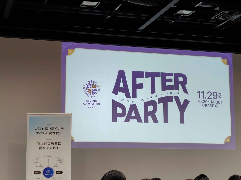 2025年11月29日にBase Q ホール(東京ミッドタウン日比谷)で開催された、Giving Campaign 2025 アフターパーティーに参加してきました。